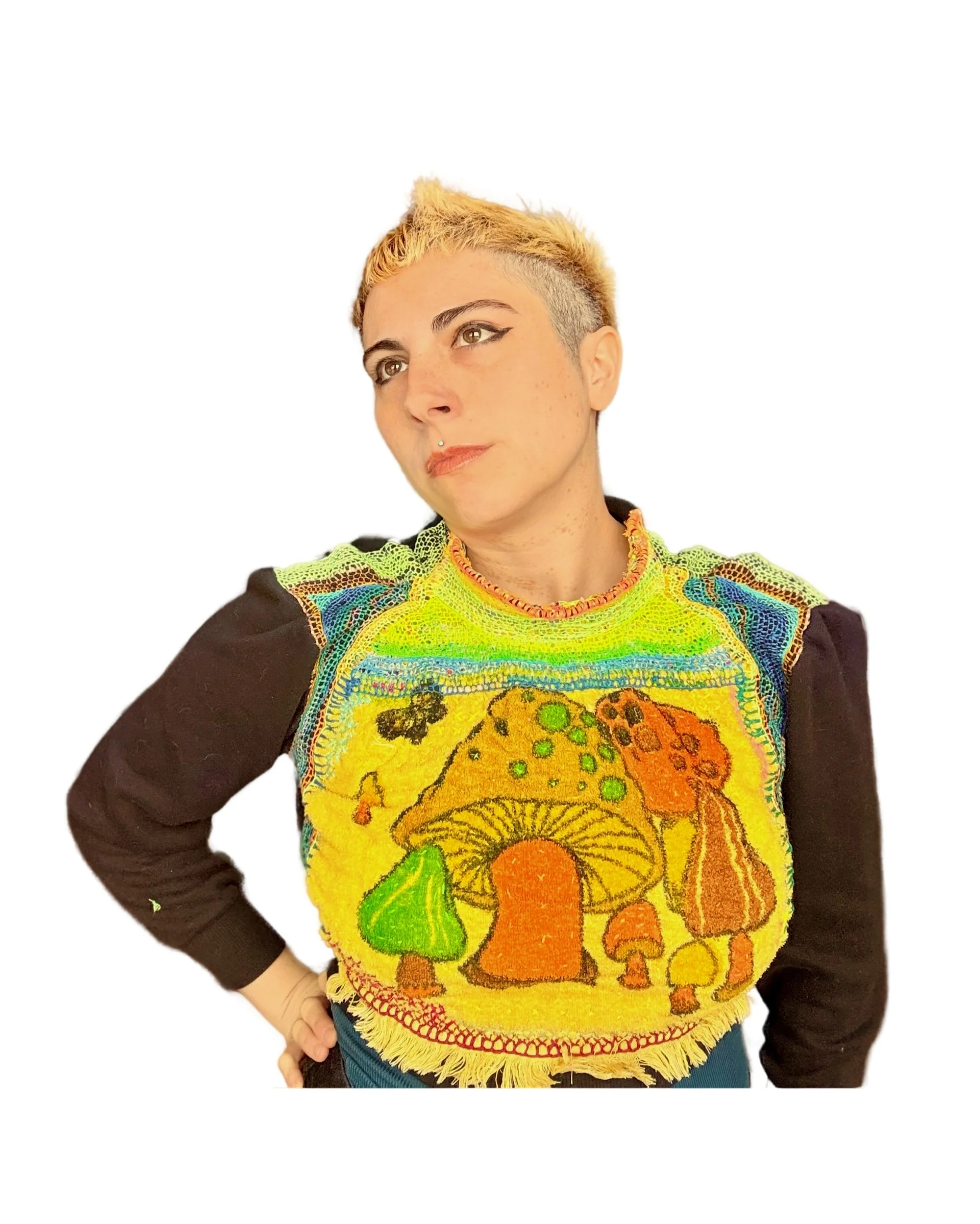 her artwork spans across a variety of mediums, from surrealist, high-texture acrylic paintings, to hyper-detailed embroidered garments, to copper plate etching design & printmaking. regardless of medium, hani’s pieces often involve themes inspired by tarot and nature, woven into stories of color and texture.